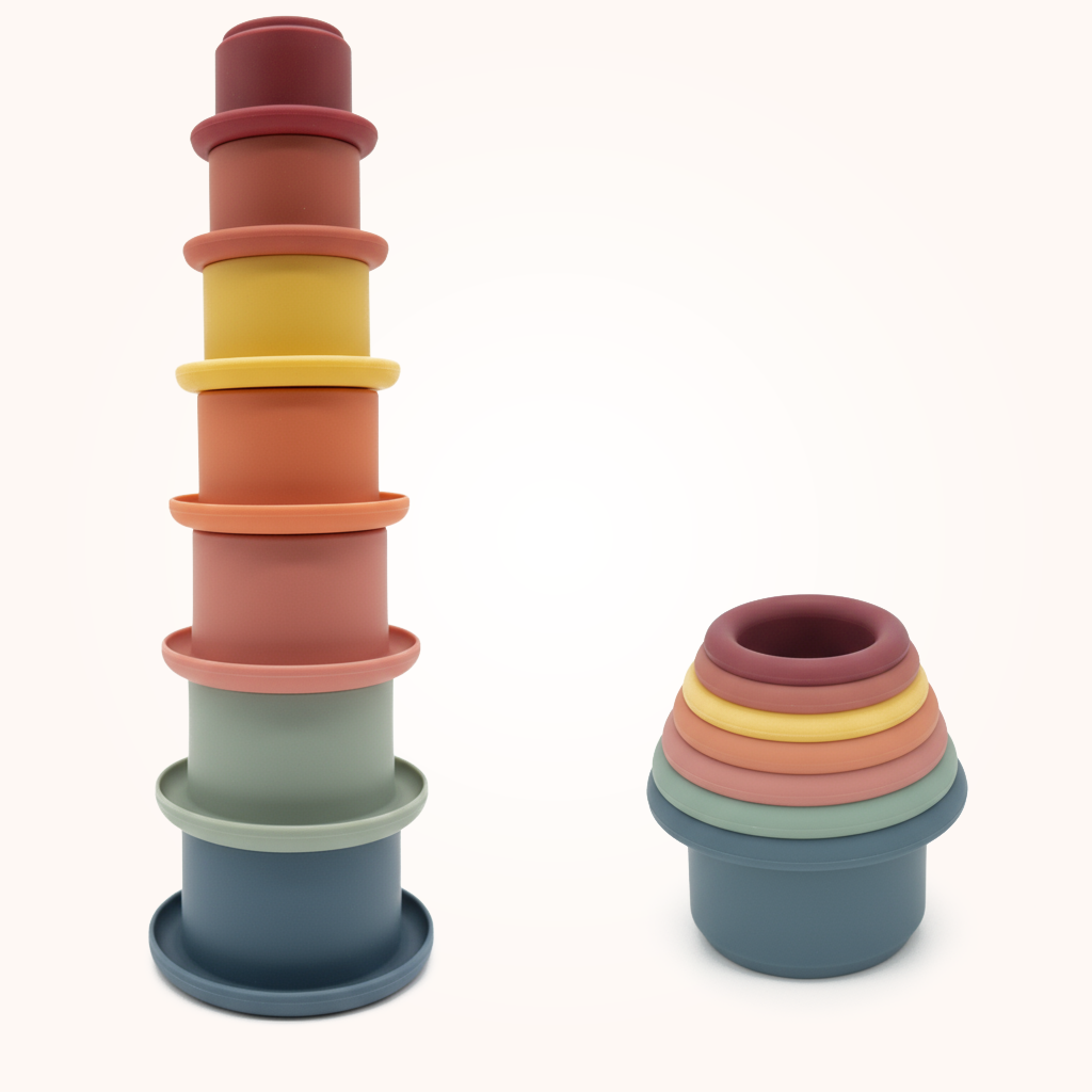 Silikonowe Klocki Kubeczki 7 szt. | Pierwsze Klocki dla Niemowlaka | Nauka przez Zabawę | Ponadczasowe Kolory